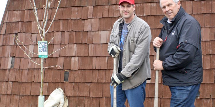 Parks Horticulturist Subforeman Wayne Lauzon and Mayor Bob Kilger planted a hawthorn tree next to the Bandshell in Lamoureux Park on Tuesday in recognition of Earth Day. The tree is just one small sign of the City’s commitment to the environment. Each year, the City plants approximately 75 new and replacement trees along City streets and in neighbourhood parks. In addition, the City will be undertaking additional tree planting efforts in the near future in response to the threat posed by the Emerald Ash Borer (EAB).