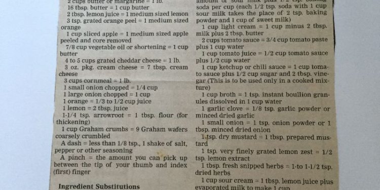 Farrah found this old column of mine, printed in 2002 in one of her Mom’s favourite cookbooks. She remembered going with her Mom to my store when just a little girl.She wondered if we could print the column again. It would be our pleasure and hopefully it will be of help to a new generation of cooks. You have all heard the old saying – you are never to old to learn – well truer words were never spoken. I thought the following equivalents and substitutions would come in handy for you some day. Next week I’ll have a list for you of what herbs go best in certain foods and more helpful hints. Enjoy a good week!
