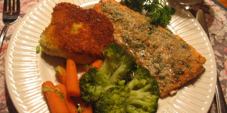 -I had some leftover mashed potatoes which I added some chopped onion and celery and a beaten egg. Then I formed them into patties, dipped them in beaten egg and then panko crumbs. While the trout was baking, I fried the potato patties until the crusty panko coating turned a nice golden brown and the potatoes were heated through.