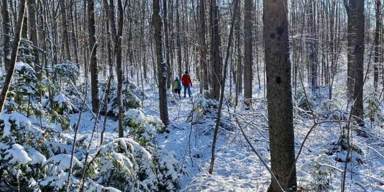 The sunshine slanting through the fragrant evergreens casts elongated shadows across the forest, highlighting the discarded pine needles on the forest floor and the tiny crisscrossed tracks of foraging critters. As we approach lower ground, we encounter a few partially frozen water hazards. The ice is thin and not to be trusted. When we cannot easily circumvent these areas, our balance is put to the test by walking carefully across logs to get across to firmer ground. Success! We all get through without incident.