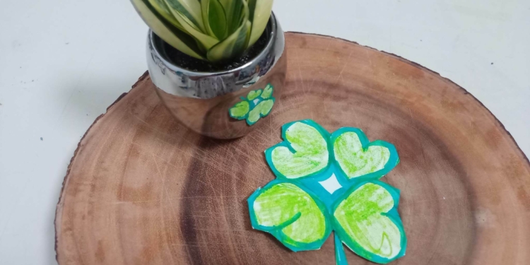 We can also use reusable paper plates. Draw four connected hearts. Cut out the shape and colour it Green.