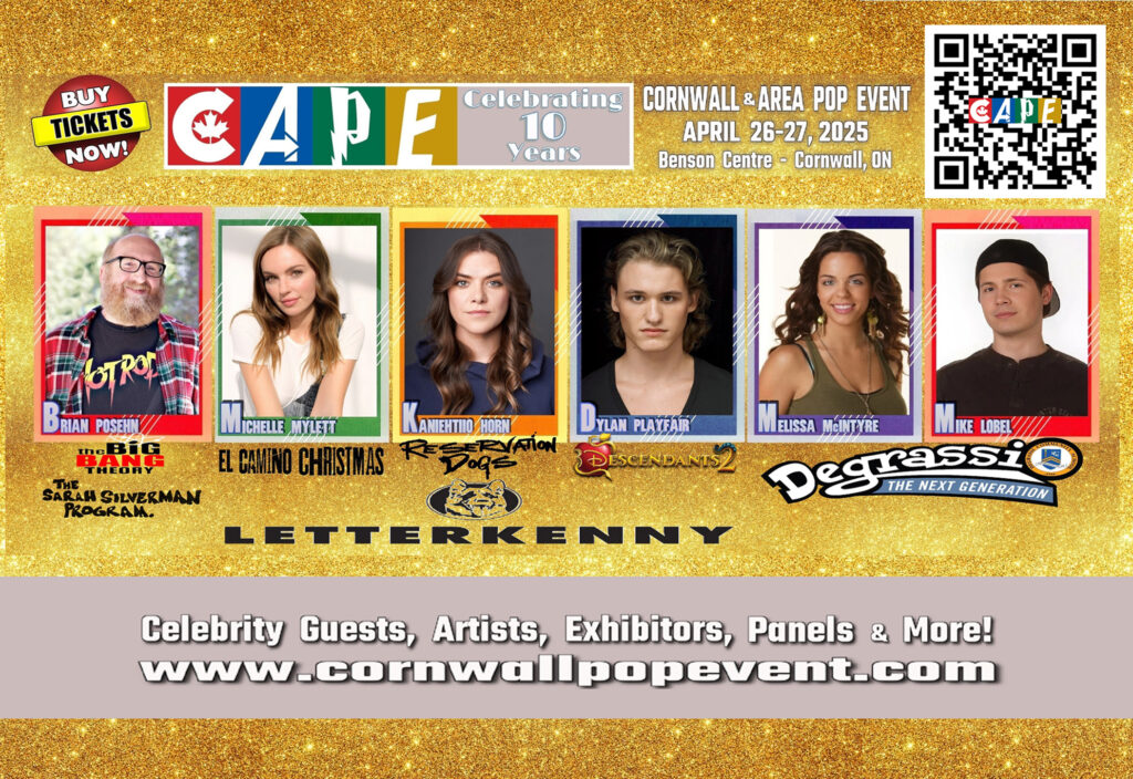 CAPE will happen this weekend, April 26-27th at the Benson Centre. Admission is $15 Saturday and $10 Sunday (+ HST). Special guests include Brian Posehn (Big Bang Theory), Kaniehtiio Horn and Michelle Millett (Letterkenny) along with Dylan Playfair (also from Descendants 2 &3). We will also feature Melissa McIntyre and Mike Lobel (Degrassi Next Generation). CAPE always features some fan favourite exhibitors every year but we also feature many new ones who join us. We will also have the panels and Cosplay Contest on Saturday. And don’t forget we also have a CAPE After Party (18+ event) being held at Best Western featuring Radio Nova Band. Plan to join us – tickets for CAPE and After Party are available at Fantasy Realm. Check out our website, www.cornwallpopevent.com for full details.