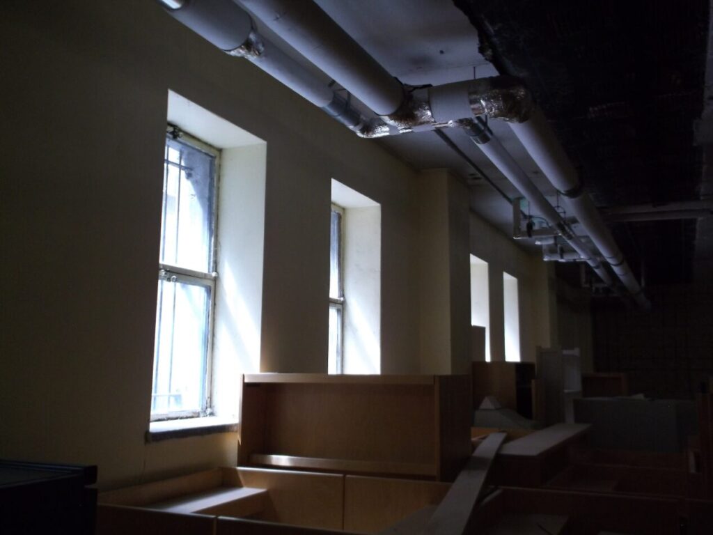 The row of large windows along the western outside wall of the Federal Relocation Unit in the former post office, made this site an impractical shelter, as Civil Defence staff would not have been able to cover the windows before a ballistic missile struck.