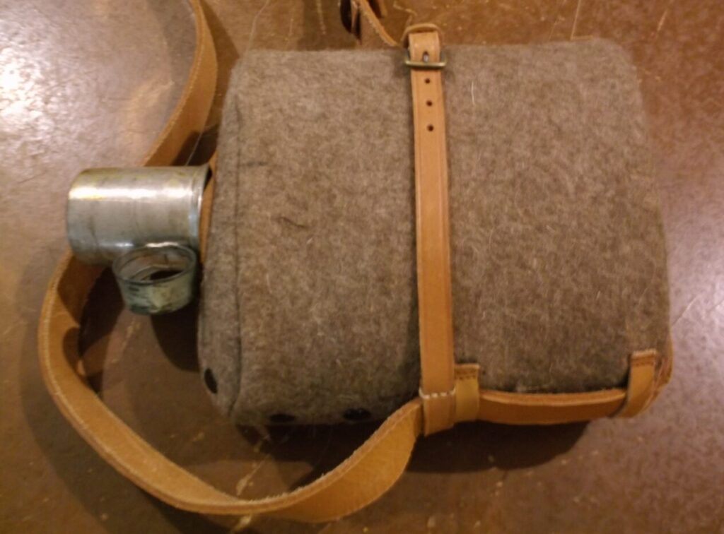 A stainless steel canteen with a cup/lid with its original wool cover and leather strap.The lid is stamped “Rigby & Mellor Ltd, 1956, Bury Lancs (Lancashire, U.K.).