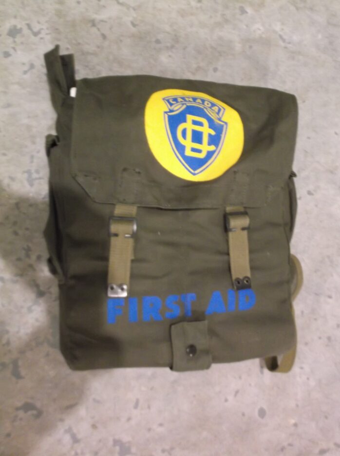 Cotton Canadian Civil Defence First Aid Pack, 1957-58. Some of the contents of the pack are: a box of 12 – 4 inch x six yards gauze bandages made by Johnson & Johnson; 3 boxes of 5 triangular bandages; 12 safety pins; one pair of first aid scissors with lanyard; 11 Mark 111 trauma bandages; a tube of Pontocaine eye ointment; Canadian Civil Defence armbands, emblazoned with the word “Health,” and two pencils.(All photos courtesy of the Cornwall Public Library.)