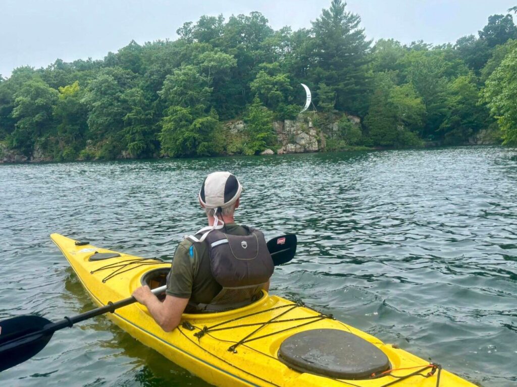 A sunset paddle to watch Gananoque’s fireworks proves to be a little bit more than we bargained for. Restless, we decide to leave early to hang out on the river. We slither amongst the yachts that have chosen to anchor here for the night to view the light show. The sunset is magnificent from this vantage point, but we are not prepared for the swarm of mosquitoes. With the fireworks delayed, we spend forty- five minutes slapping at the voracious pests and voicing the occasional “ouch!” Finally, the first firework explodes, soon followed by a collective cheer. The colourful bursts reflected on the water’s surface are dazzling, and before long, the mosquitoes are all but forgotten. As the last of the smoke dissipates in the air, we turn on our lights to retreat to our camp. To our dismay we immediately realize that the mosquitoes have been replaced by thick clouds of shadflies. Attracted by our headlights, they dart at our faces. We paddle frantically, but try-as-we-might, we cannot divert head-on collisions with these flying beasts. Blinking our eyes and spitting out unwanted proteins, we race to the imaginary finish line. For obvious reasons, no one dares open their mouth to speak. Landing safely and away from the fluttering creatures, someone sums up our hasty evacuation with “That was nasty!” It surely was, but totally worth it in retrospect.