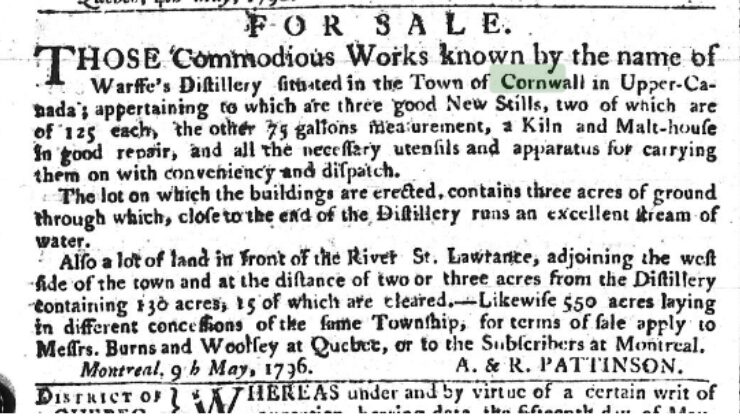 Stone’s Cornwall works were acquired by Richard and Marianne Warsse. Warsse’s distillery remained in business until 1795, when a notice in the November 23 edition of the Quebec Gazette informed creditors that the distillery was in default.