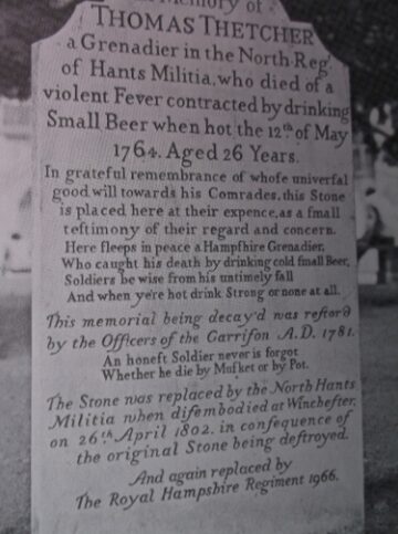 (Photo 1 – caption:) This refurbished 1764 tombstone to British Grenadier Thomas Thetcher proclaims: “An honest Soldier never is forgot Whether he die by Musket or by Pot.”