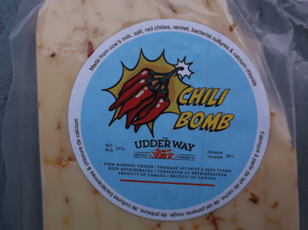 You haven’t had “chili” cheese until you have tried Udder Way’s product. Unlike the spicy cheese made by the big corporations, where the cheese base is only there to hold the “heat,” “Chili Bomb,” delivers heat with a real cheese base. The best spiced cheese I have ever had.