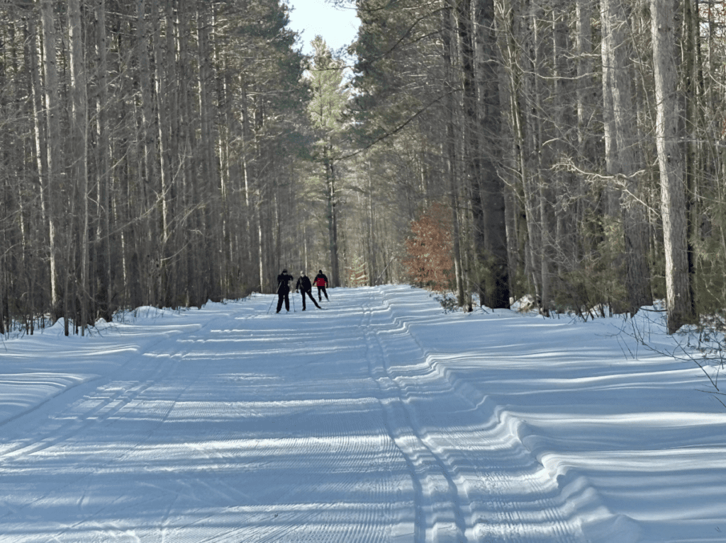 With a plan in place, the three remaining skiers can stick together. The pressure to keep up has been eliminated. I am not worried about the distance. I have the endurance to complete the 9-km loop we have chosen. Crisscrossing the forest, the wide and mostly flat trails are always perfectly groomed for both classic and skate skiing.