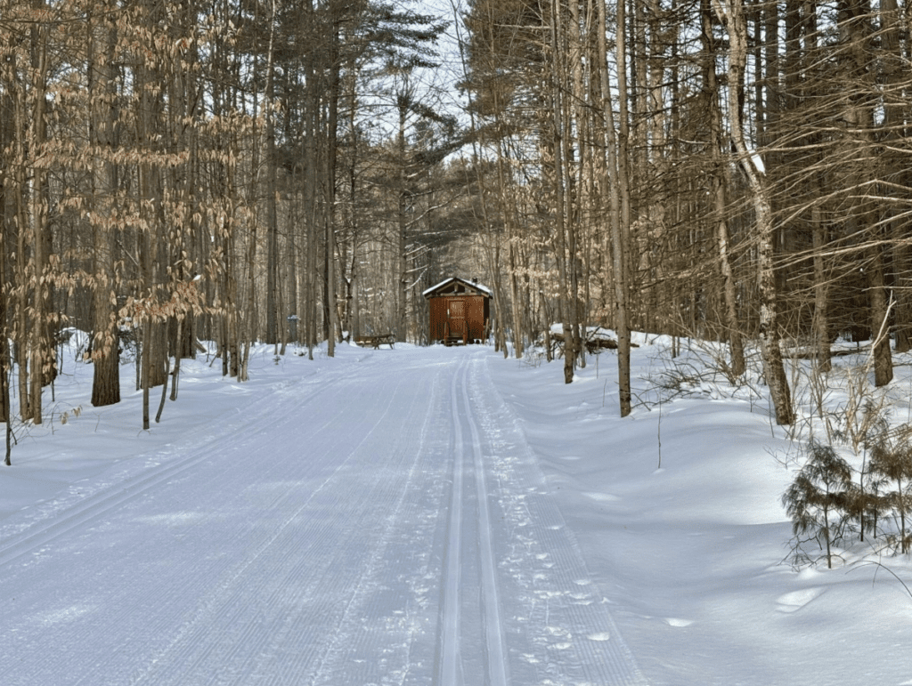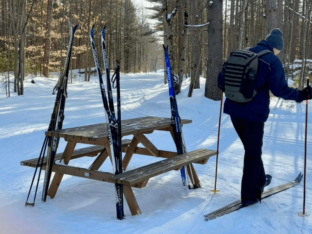 By the time we finally reach the warming hut, we have gone more than halfway around our loop. As promised, the rest of our group is inside and engrossed in conversation. The small hut is crowded but we squeeze around the table grateful for the heat from the small woodstove. We talk of everything and nothing, just happy to be enjoying a day in the outdoors. When other people start arriving, our friends who have been there the longest decide to vacate their spots. They will do a 15-minute loop and come back to meet us.